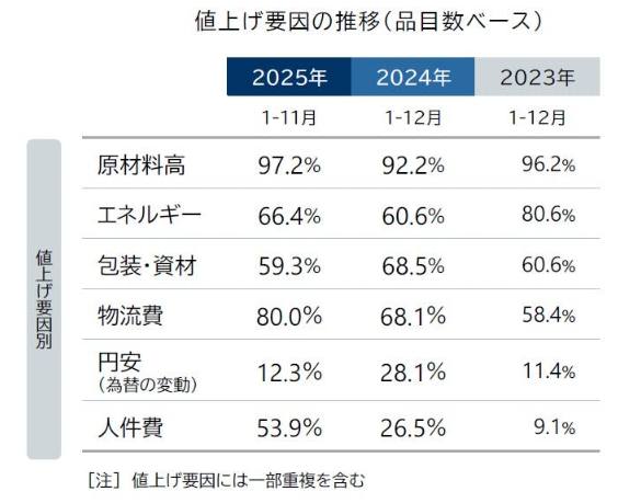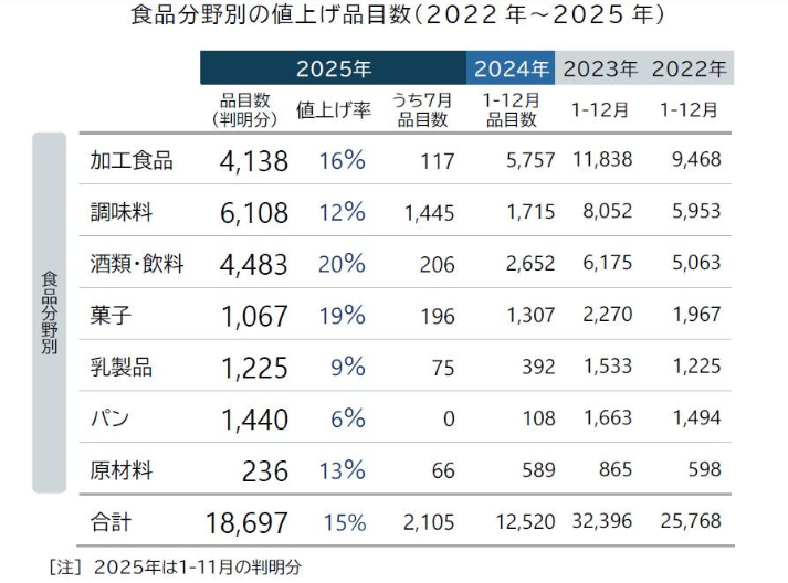 6月末までで判明している2025年中の値上げ品目数は1万8697品目となり、7月には2万品目を超える見通し。